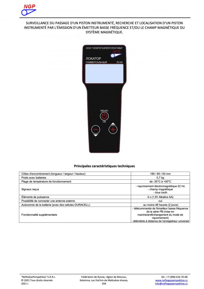 Le localisateur universel est utilisé pour la surveillance des canalisations en ligne, la recherche et la localisation des canalisations en ligne par le rayonnement de l'émetteur basse fréquence et/ou le champ magnétique du système magnétique.