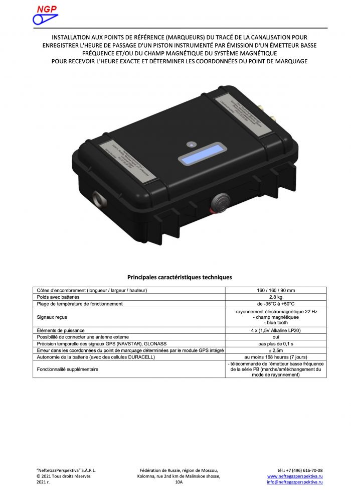 Montés dans des points de référence (marqueurs) du tracé de la canalisation pour enregistrer le temps de passage du projectile dans la canalisation au moyen des émissions de l'émetteur basse fréquence et/ou du champ magnétique du système magnétique.