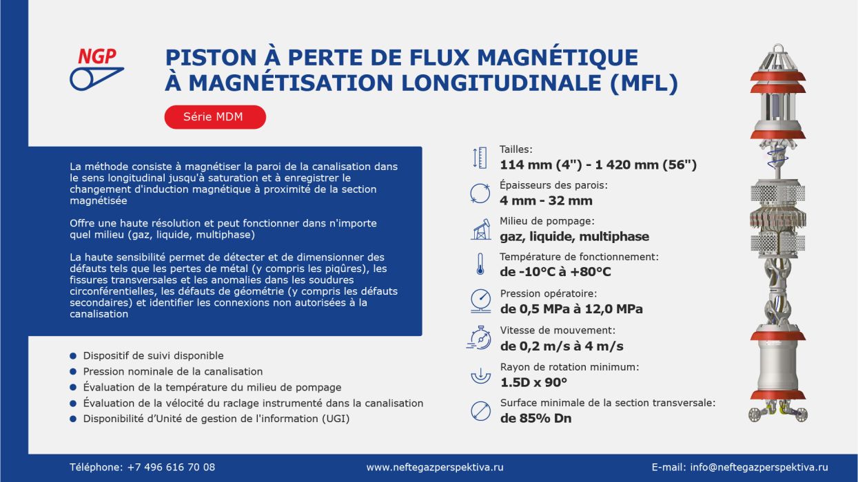 Les pistons à perte de flux magnétique (MFL) en ligne à haute résolution développés par “NGP” S.A.R.L. sont capables de détecter et de dimensionner des anomalies telles que les pertes de métal, les fissures transversales et les anomalies des soudures en anneau. Ils possèdent l'une des meilleures caractéristiques pour déterminer la position angulaire des caractéristiques et la distance parcourue, une probabilité accrue de distinguer les défauts internes et externes, ainsi qu'un faible niveau de bruit, ce qui permet une détection plus précise de la corrosion de fond.